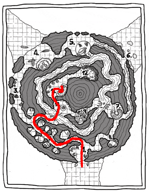 Here is another quick example: pulled from my adventure titled: Tiny Terrors where the peasants get shrunk down and sent into the heart of a tree to kill a termite queen. In this one there are three entrances into the tree, and the end location is the Queens throne. This one was better designed, 12 rooms, and players regularly hit 4-6 rooms. Plus, the sap river can throw players around a bit and create even more diverse roots (routes?).
