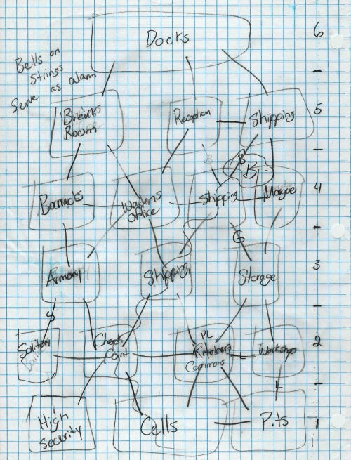 For example: I began working on an adventure for Peasantry called: Shackles and Sharkteeth. The players would Start locked up in cells and would need to escape the underground island prison at the End where the ships are loaded to leave the docks. I originally wanted about 15-20 rooms and wanted the players to pass through at least 6-8 rooms along the way. I then proceeded to lay a grid of the rooms and make connection points between them. Organizing them in a way that made sense for the prison layout.