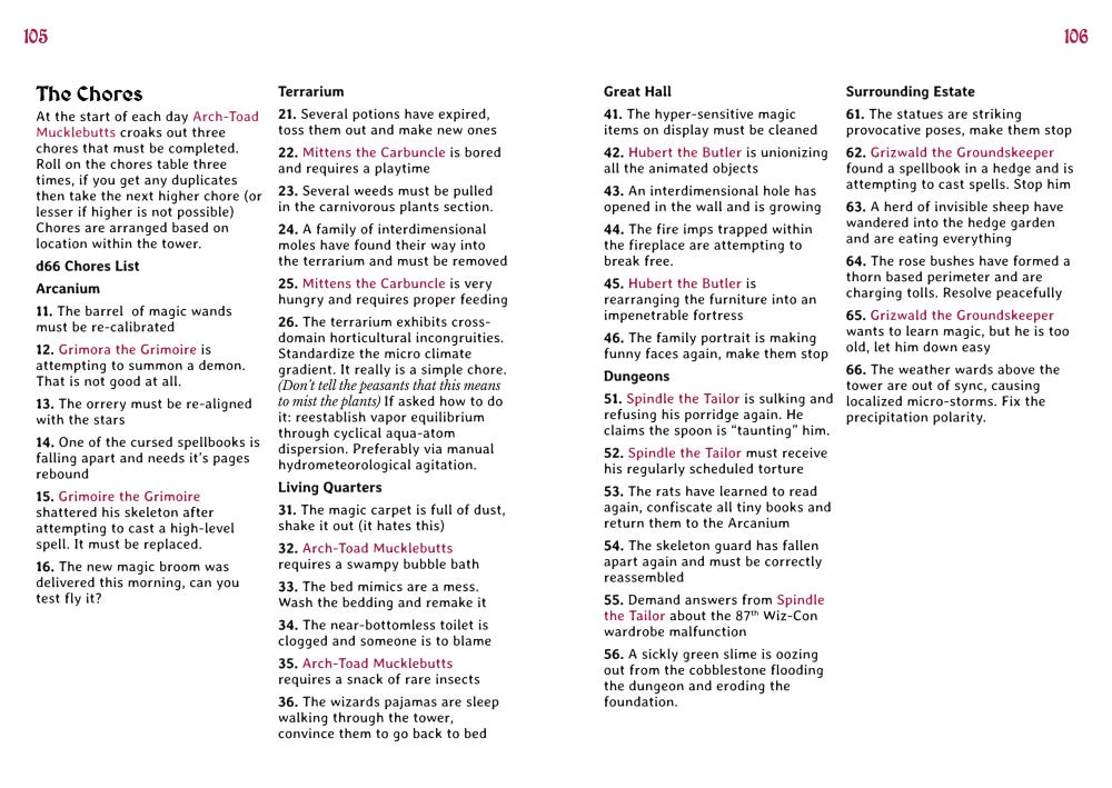 Here’s an Example: Another adventure I have been working on is A Wizard’s Sojourn. In this one the peasants are house sitting for a wizard for a few days. Every new day they must roll on this d66 table to determine what chores need to be done. The tower is only 6 locations big, but there are 36 different chores that could occur! On top of that, there is a separate list for Guests who visit the tower! While this five (6) room dungeon may not be expanded by its # of rooms, it is greatly expanded in its # of content and replayability due to these tables. These tables are also organized by locations. So, each location has 6 different possible chores.