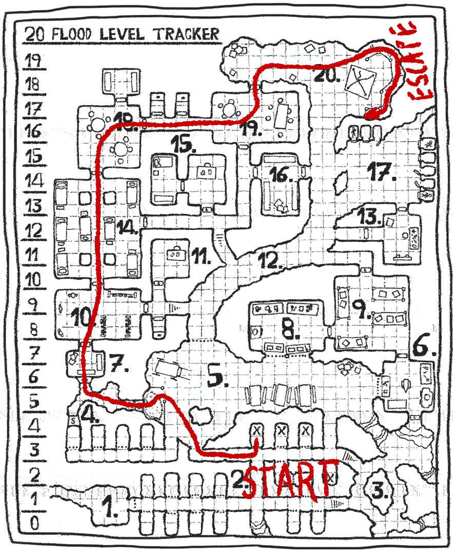 So, the five-room dungeon recommends 5 rooms because it is highly likely that the players will be able to move through all of these rooms within the allotted session time. But what if I want to make a dungeon with 20 rooms? How will my players be able to make their way through it within the allotted time? The unfortunate answer to that is: They won’t hit every room along the way.